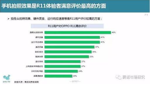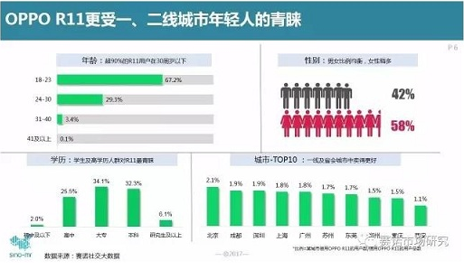 其中,在OPPO R11的用户群体中,超过90%的R11用户年龄在30周岁以下,18~23岁更是达到67.2%,可见OPPO在年轻用户中很受欢迎;性别方面,女性比例达到58%,男性比例为42%,整体基本均衡;同时,OPPO R11也更受高学历用户以及一二线城市年轻人的青睐。由此可见,凭借多年对市场的耕耘和每年一到两款爆款产品,OPPO已经成为年轻用户的首选手机品牌。