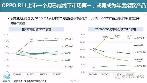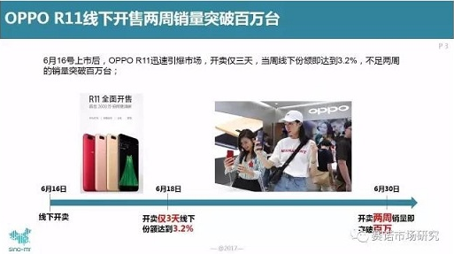 早前赛诺发布的6月份中国智能手机报告显示,自6月16日开售以来,OPPO R11仅用半个月的时间即成为线下市场2500-3000元价位段第一。而据赛诺最新市场研究数据显示,OPPO R11开卖仅3天线下份额就达到3.2%,开卖两周销量即突破百万,上市一个月已成线下市场第一。是什么造就OPPO R11如此惊人的畅销奇迹,并在一众大品牌中脱颖而出,赛诺通过大数据的方式来为大家揭秘。