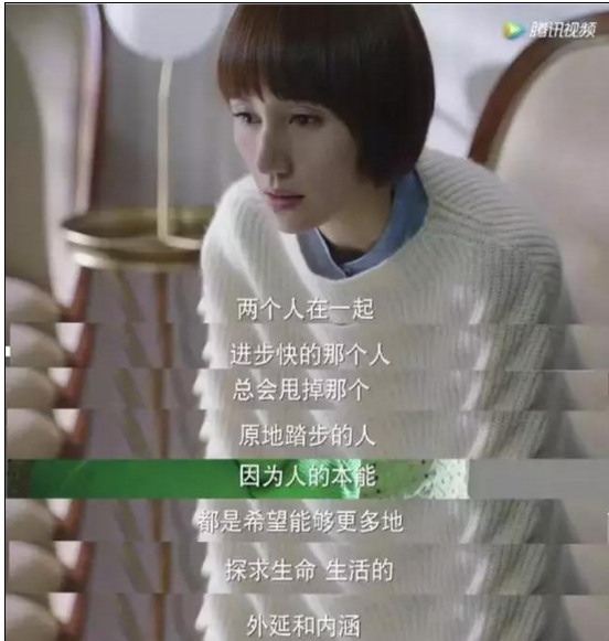 而她的闺蜜唐晶则是独立自主,视事业为生命的职场白骨精。她虽然有男友,但经济、精神都独立,不过度依赖对方,也不盲从。就算最后感情没能开花结果,她还是可以活得很漂亮。剧中唐晶有句话非常经典:“两个人在一起,进步快的那个人,总会甩掉那个原地踏步的人。因为人的本能都是希望能够更多地探求生命、生活的外延和内涵。”