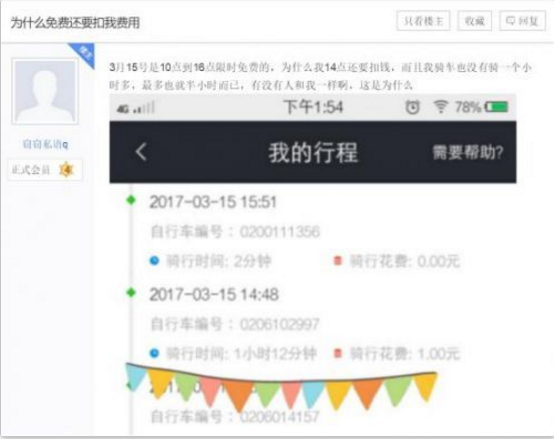 其实早在今年3月,就有贴吧网友称自己在摩拜免费活动期间被扣费,并晒出截图为证。“3月15号是10点到16点限时免费的,为什么我14点还要扣钱?而且我骑车也没有骑一个小时多,最多也就半小时。”
