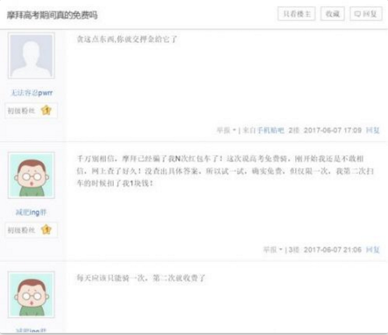 甚至有热心网友还发帖敬告广大消费者“高考骑行不是完全免费”。同时,该网友称:“不仅如此,综合骑行数据,红包车有10%左右的几率会收费,摩拜喜欢玩假营销”。