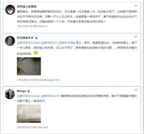而自从进入六月以来,随着全国各地雨季的到来,摩拜单车一直备受争议的挡泥板问题再次成为用户的槽点集中地。从微博、贴吧等平台,可见大量投诉贴,称摩拜单车的挡泥板根本不起作用,雨天骑行结束,后背被甩满泥水,导致许多用户直接弃用摩拜。