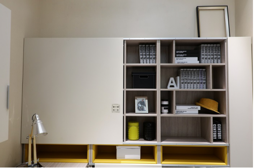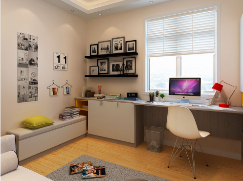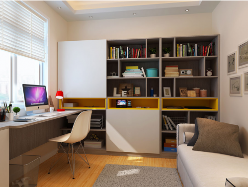 整体感觉:印象·极简系列采用利落简洁的直线线条,配以清新素雅的空间色调,实用且朴实无华。书柜、书桌、墙上隔板、卡座自成一体,角落再配上一个简约沙发,可坐可卧可躺,让看书成为一种享受。