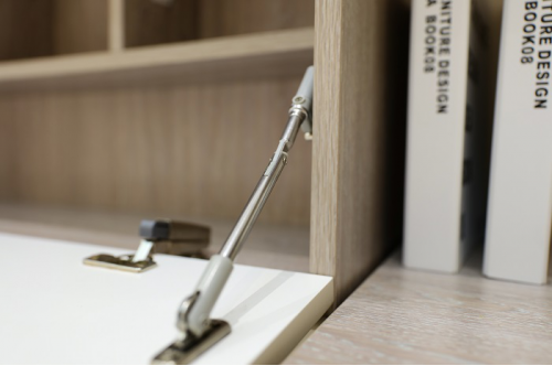 2.带缓冲式气压撑。上下翻门采用带缓冲式气压撑,45#钢材质,单根承重25kg,轻松开启,轻柔关闭。