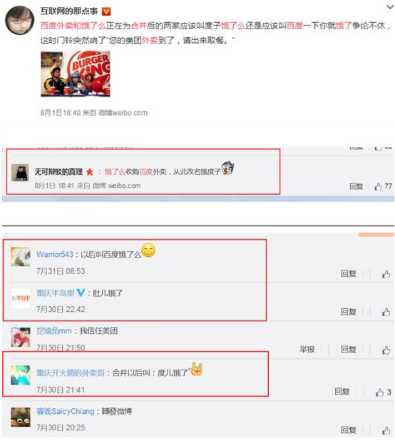 其中,微博大V@互联网的那点事发文调侃:“百度外卖和饿了么正在为合并后的两家应该叫度子饿了么还是应该叫百度一下你就饿了争论不休,这时门铃突然响了‘您的美团外卖到了,请出来取餐’”。这则微博迅速引发网友的爆笑围观,一时间,“饿度子”、“百度饿了”、“度儿饿了”等名字层出不穷。