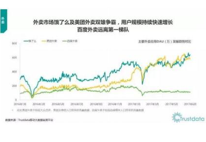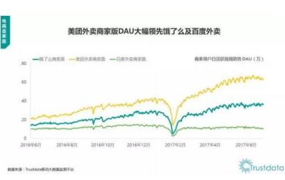而前百度外卖高管王耀弘在文章《从此江湖再无百度外卖?》中则推荐了TrustData近日发布的《2017年上半年中国移动互联网发展分析报告》。报告显示,美团外卖独立App(不包含大众点评、美团及微信入口带来的流量数据)的用户规模在上半年的多数时段里超过饿了么;而在商家端,美团外卖的日活跃用户数量已经大幅度领先饿了么和百度外卖。