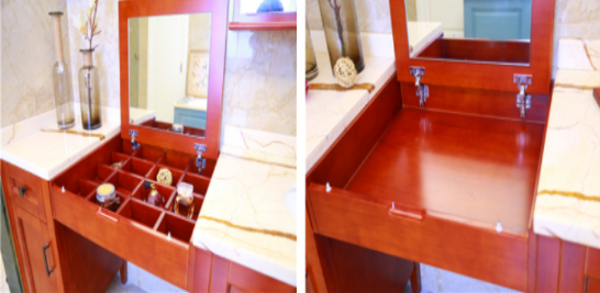 懂生活的女人,很懂得拾掇自己,每天以最好的状态出门,展现最好的面貌。这梳化打扮变美的过程,怎么少得了化妆台呢?美式浴室柜定制空间里的化妆台,是女人的专属百宝箱,化妆品、香水、首饰、胸针等各种装扮的必需品,你都可以整齐地摆放在这里,取用方便,还有一块超大的镜子供你化妆打扮使用。取走中间的收纳格,化妆台可以当收纳盒使用,你的一些生活大物件可以存放在这里。平常不使用的时候,只需盖上镜盖,即可当桌子使用。一物三用,这样的设计,是不是十分贴心又实用。
