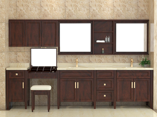 安华卫浴的美式定制卫浴空间,最懂女人的表现,在于美式浴室柜定制空间的化妆台和收纳的设计。