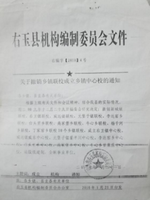 宋发曾于2007年8月到2009年8月担任右玉县新城镇联校校长,2009年8月,全县校长会上局长王占山宣布撤销新城镇联校,免去了宋发的联校校长职务,并交代原会计邢斌将原新城镇联校全部职工(包括退休职工)的花名册报交教育局进行分流,宋发移交了全部财产后(包括办公室)接受了离任审计。2010年1月21日右玉县编委会正式下发红头文件(右编字[2010]4号),撤销右玉县新城镇联校。