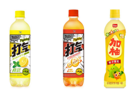“打气”区别于传统碳酸饮料和功能饮料,为果汁+气泡+复合维生素饮料。“打”体现动感活力;“气”体现含气饮料;“打气”则寓意积极向上正能量。口味上既有果汁的清爽,又有丰富气泡刺激,还有复合维生素补充能量,给人全新饮用体验。“加柚”谐音“加油”,体现了加油鼓劲之意;“柚”则传达含柚粒的产品利益点。酸甜橙汁、清爽西柚汁带来清新口感;源于琯溪蜜柚的饱满大柚粒,边嚼边喝满足年轻人的新奇饮用需求。除了口味独特,“加柚”“打气”还满足95后、00后的情感诉求。面临困惑,挫败等种种“泄气漏油”情绪不可避免,“加柚”“打气”则激励这些对未来迷茫不安的年轻人,给他们无限正能量!产品包装上,“打气”用黑白漫画迎合二次元文化,“为自己打气”标语充满热血中二之气;“加柚”采用卡通拟人柚橙形象,俏皮可爱又能体现含柚粒果汁信息。“我为漂亮加柚”口号也符合年轻人对“颜值”的不懈追求。