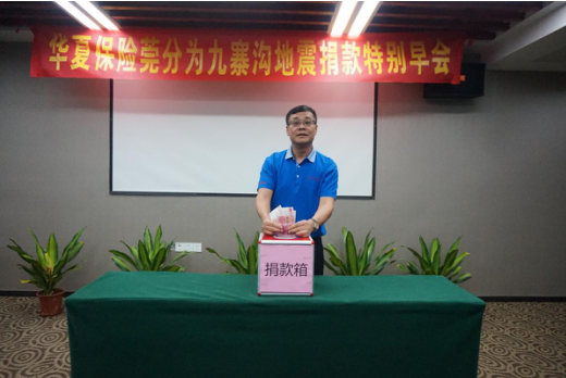 为向灾区同胞送去温暖,8月10日上午9点,华夏保险东莞分公司举办了“点亮希望,祈福九寨——为九寨沟地震灾区捐款”特别早会,号召全体员工为四川九寨沟地震灾区捐款,公司总经理室成员及全体内勤员工参加了会议。