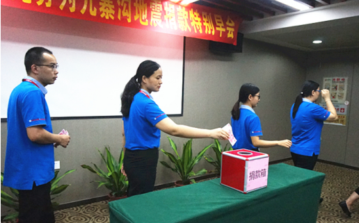 早会主持人向全体参会人员介绍了九寨沟地震灾情,并宣读《倡议书》,号召全体员工为灾区捐款,支援灾区同胞。总经理屈万众更号召外勤员工共同加入捐款行动,共同践行华夏大爱精神。捐款环节开始后,华夏保险东莞分公司总经理室带头进行了捐款,其余员工纷纷慷慨解囊,有序进行捐款。经过统计,华夏保险东莞分公司及其分支机构合共捐款18808元,善款将通过华夏慈善基金统一捐到灾区。