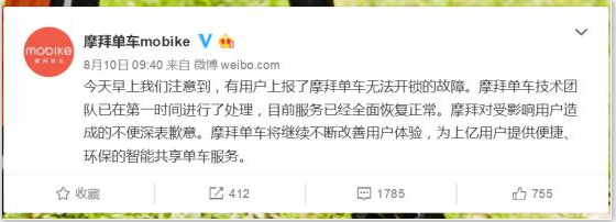 当日9点40分,摩拜单方面发布声明,称已第一时间处理,服务已恢复。