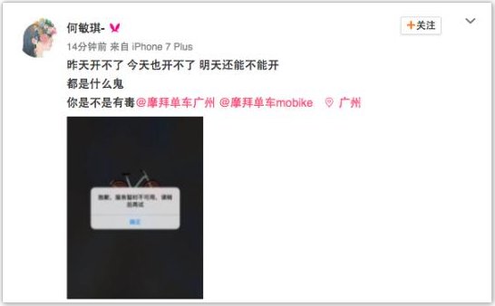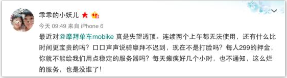 一位女性用户在微博评论称,““最近对@摩拜单车mobike 真是失望透顶。连续两个上午都无法使用,还有什么比时间更宝贵的吗?口口声声说骑摩拜不迟到,现在不是打脸吗?每人299的押金,你就不能给我们用点稳定的服务器吗?每天瘫痪好几个小时,也不通知,这么烂的服务,也是没谁了! ”