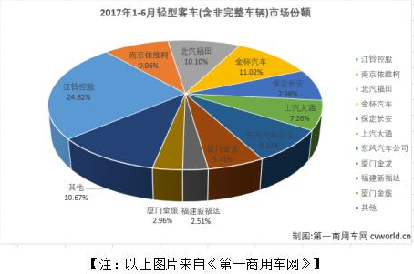 据《第一商用车网》统计,2017年上半年轻客市场整体累计销售166493辆,出现负增长降幅达到8.32%。排名前十位的10家轻客企业中,上半年累计销量三升七降,其中江铃控股稳居第一位,累计销售40995辆,累计增长19.28%,6月份同比增长67.75%。江铃控股2017年上半年销量占轻客市场份额24.62%,远超第二名南京依维柯的9.06%。
