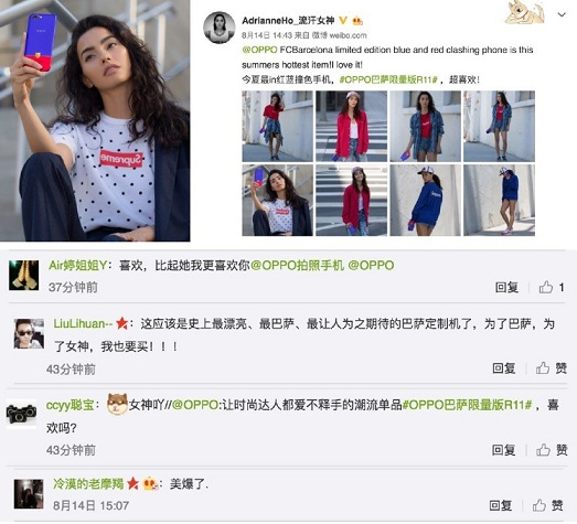 OPPO R11巴萨限量版发布之后,也在国际上引起了巨大反响,国外知名时尚博主 Adrianne Ho_流汗女神第一时间晒出一组与R11巴萨限量版街拍的照片,表达出自己对R11巴萨限量版的喜爱,并拍摄了活力四射的短视频。更有网友评论,这应该是 “史上最漂亮、最巴萨、最让人为之期待的巴萨定制机了”。