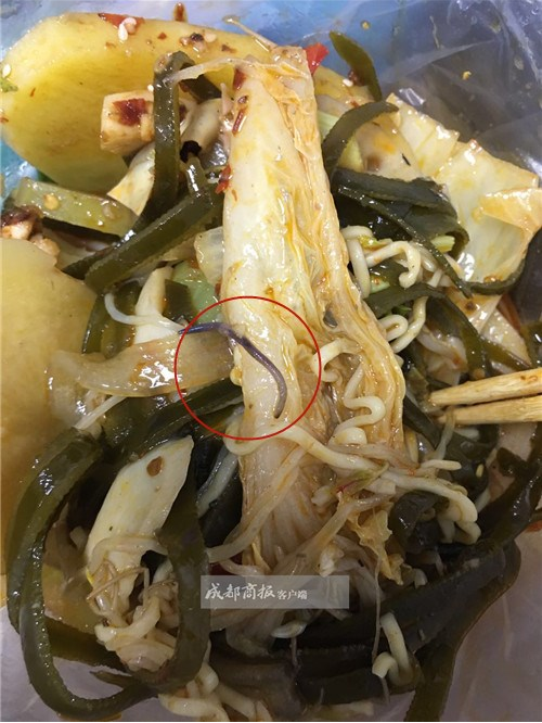 “是一条蚯蚓。”于女士看着菜里的东西,头皮一阵发麻,赶紧跑去漱口。于女士透露说,之前她也点过这家冒菜,之前觉得味道不错,还连着吃了几天。“如果出现蟑螂还好,出现蚯蚓这种软体虫类,感觉还有点恶心。”于女士到办公室楼下点了一份方便面,吃了一半,还是没能吃完。