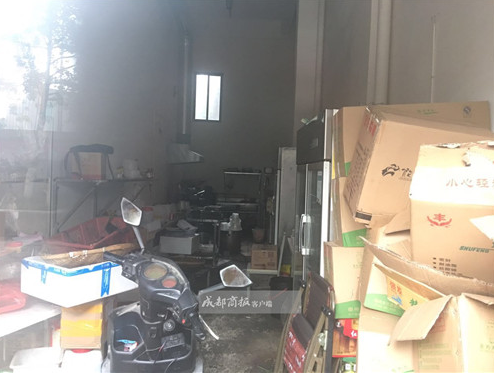 店门口放着一辆摩托车,里面的灶台周边,散乱地放着一些油桶、快餐盒,靠墙的位置,堆放着一些纸壳,和冰箱一样高。
