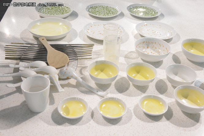 为了印证方太水槽洗碗机Q7的实际操作效果,我们找来了新鲜刚刚从菜场买到的水果蔬菜,以及根据国际清洗标准制备的特殊清洗道具,包括碗、筷子、勺子、碟子等等,里面还有黄油、菜叶、鸡蛋等。