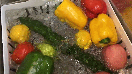 ▲高频超声每秒在水中产生数以万计的微小气泡 注意看西红柿表面的无数小气泡