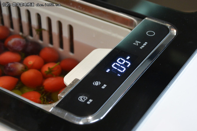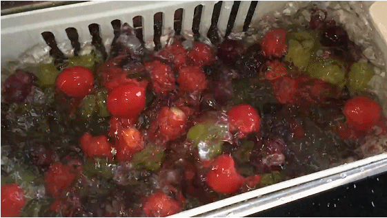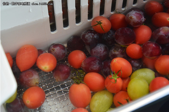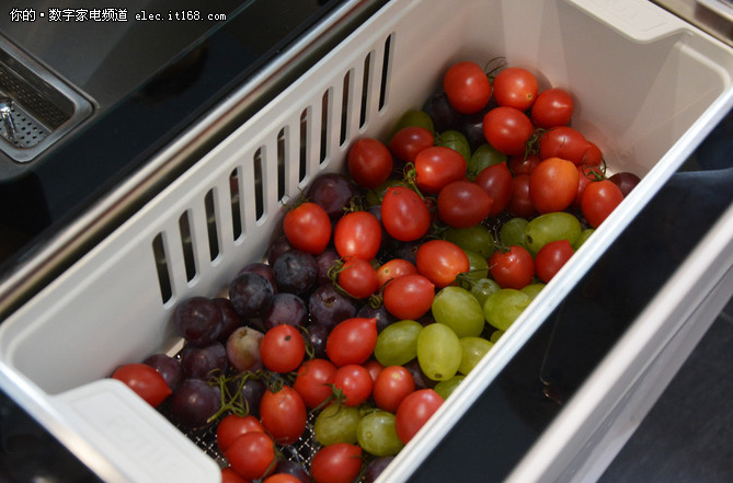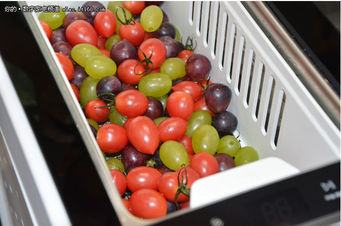而这时,边上的果蔬槽还空着,自然不能让它闲着。在洗碗机工作的同时,我们还可以将水果在果蔬清洗槽中进行处理。我们选择将葡萄和小西红柿进行混洗,看看这种表皮比较软的水果它是否可以顺利洗净。