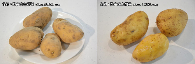 趁着洗碗槽距离工作结束还有时间,我们再次为果蔬槽的评测提升难度,这次挑战比较难洗的土豆,下面就是清洗前后的对比效果,可以看到上面很多的尘土都被清洗掉了。