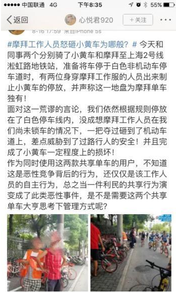 8月16日下午,这位名为“心悦君920”的网友在微博表示:今天和同事两个分别骑了摩拜和其他品牌的单车行至上海2号线淞虹路地铁站,准备将车停于白线划定的非机动停车道时,有两位身穿摩拜工作服的人员出来制止其他单车的停放,并声称这一地盘为摩拜单车独有。