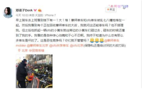 在今年早些时候,就有一位北京网友@邓遥子DorA在微博爆料:早上骑车上班的时候,面对摩拜单车和其他竞品单车乱七八糟的堆在一起,一名摩拜工作人员抓起一辆竞品就往旁边的其他单车们砸过去。其行为简直让人叹为观止。网友还表示“我看的是各种惊心动魄和用心不忍“。