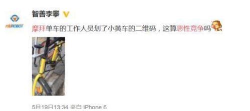 5月19日,一位名为“智善李攀”的网友在微博爆料:摩拜单车的工作人员划了其他单车的二维码。