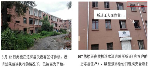 其次,征收程序不合法,在3月份,郊区分管副区长主持招开的预征收大会上,明确说“对于原北方机械厂106栋,107栋楼,市政府无项目,无方案,两楼动迁是搭棚户区改造进行的。”接着又说,市政府对此事很重视,一定要达到95%以上居民同意后再启动拆迁”,(居民提供了现场录音)现实情况却是:4月份真正拆迁启动后反而无公告、无论证、无评估了。以106栋107栋为例,50%以上居民没签字,指挥部就开始强拆了,(采取的是株连式拆迁,把所谓“同意”的住户家的门窗扒掉,把公共空间设施,楼道护栏、单元门等再相继拆掉,随之断水断电,人为造成破败的拆迁假象)并且没按国务院征收条例要求,先期筹备充足征收资金建立专款帐户,首先支付征收资金安置费用再让居民搬迁,而是先把居民房屋扒掉了,且几个月后也没完全真正全部兑现征收款。
