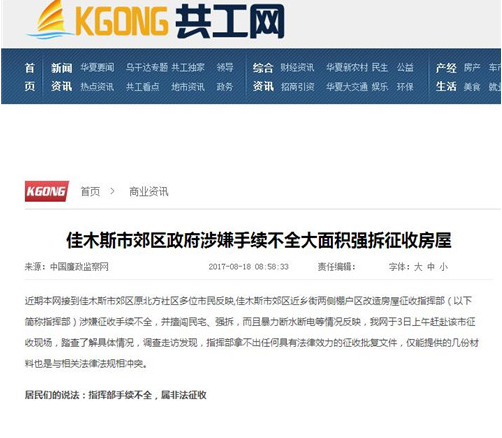 近期本网接到佳木斯市郊区原北方社区多位市民反映,佳木斯市郊区近乡街两侧棚户区改造房屋征收指挥部(以下简称指挥部)涉嫌征收手续不全,并擅闯民宅、强拆,而且暴力断水断电等情况反映,我网于3日上午赶赴该市征收现场,踏查了解具体情况,调查走访发现,指挥部拿不出任何具有法律效力的征收批复文件,仅能提供的几份材料也是与相关法律法规相冲突。