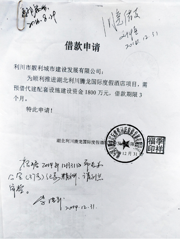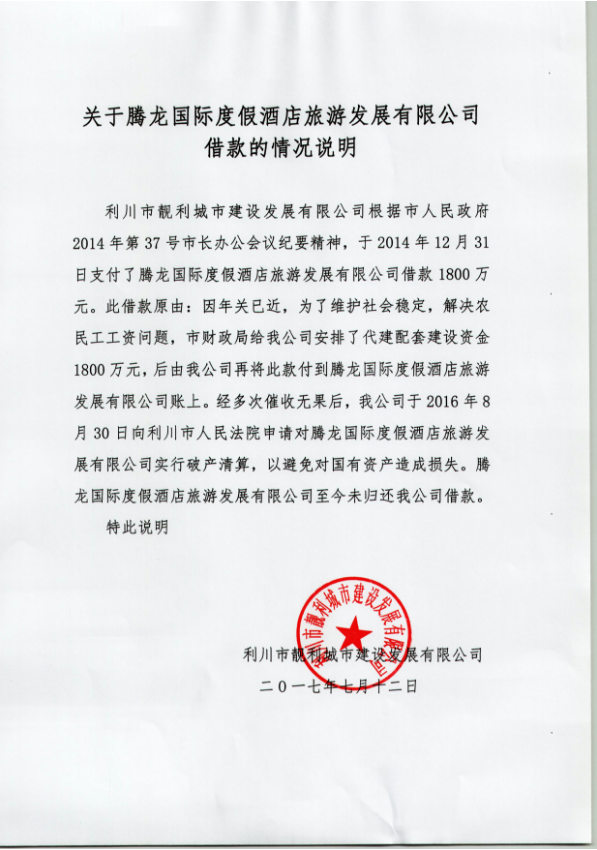 为顺利推进腾龙酒店项目,2014年12月31日,经利川市政府市长办公会议决定:“原则同意由利川靓丽城市建设发展有限公司(当地国有企业)(以下简称靓丽公司)给腾龙公司先期预借酒店配套市政基础设施建设代建资金1800万元。”