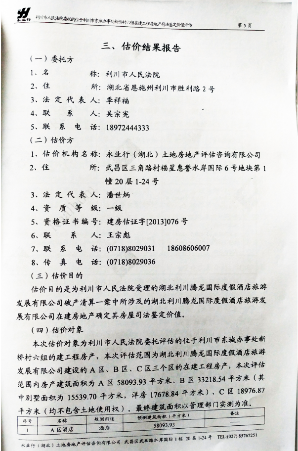 据管理人于2017年7月24日,向《企业观察报》提供的由永业行(湖北)土地房地产评估咨询有限公司出具的腾龙公司资产评估报告中显示:评估委托方为利川市人民法院,法人代表:季祥福,联系人:吴宗宪。在该评估报告中,腾龙公司B、C区的城镇住宅用地使用年限截止日期写成2050年12月7日,土地剩余年限63年。而实际上B、C的土地使用截止日期为2080年12月7日。