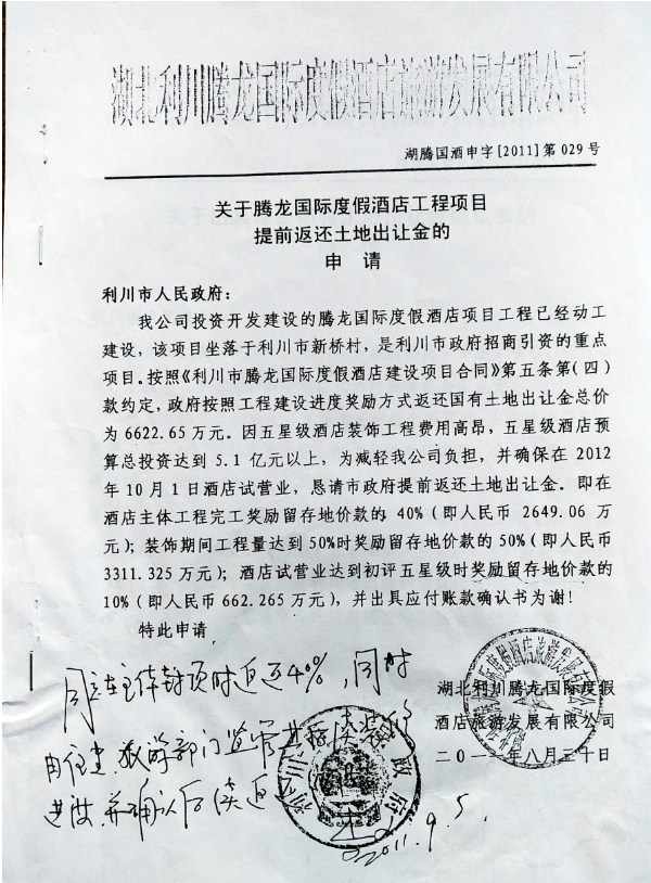 2011年8月30日,腾龙公司请求利川市政府把合同约定返还的20%土地出让金,提高至40%。具体内容为:“因公司投资开发的五星级酒店装饰工程费用高昂,为减轻公司负担,确保在2012年10月1日酒店试营业,恳请市政府提前返土地出让金。即在酒店主体工程完工奖励留存地价款的40%(即人民币2649.06万元);装饰期间工程达到50%时奖励留存地价款的50%(即人民币3311.325万元);酒店试营业达到初评五星级时奖励留存地价款的10%(即人民币662.265万元),并出具应付账款确认书。”