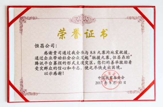 2017年8月8日21时19分,阿坝藏族羌族自治州九寨沟县发生7.0级地震,灾情发生后,引起了全国人民的关注。为了第一时间救助灾区,恒昌在地震发生后立即启动应急机制,积极开展救灾捐献行动。8月9日一早,恒昌宣布捐赠现金给到中国扶贫基金会用于紧急救援和过渡安置等应急救灾行动,同时还通过腾讯公益微信平台“一起捐”,在全公司上下发起“驰援九寨,恒昌鼎助”捐款倡导活动。截至2017年8月15日13时35分,“驰援九寨,恒昌鼎助”倡议共计募集善款14万余元。为了感谢恒昌积极倡导募捐的善举,中国扶贫基金会也为恒昌公司颁发了荣誉证书。