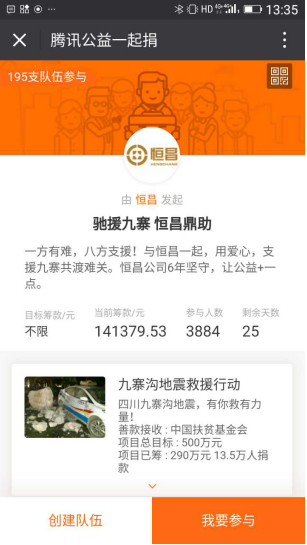 截至2017年8月15日13时35分,“驰援九寨,恒昌鼎助”倡议共募集善款14万余元