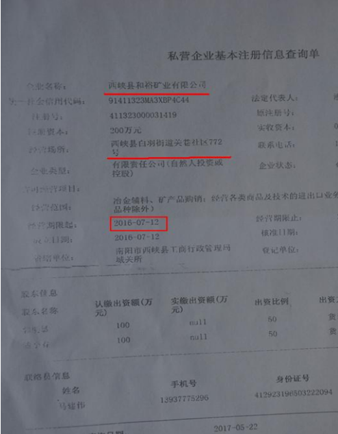 西峡县工商局资料显示:和裕矿业有限公司成立于2016年7月12日,核准日期为2016年10月24日,经营所字地西峡县白羽街道关巷社区772号,注册资本200万元。记者到西峡县白羽街道关巷社区772号采访该公司,但看到的是关巷社区居委会,和裕矿业有限公司无任何牌子、设备、人员等。由此可见,和裕矿业有限公司是“无中生有”,只在西峡县工商行政管理局登记,却从未到管辖单位西峡县工商行政管理局城关所办理相关注册手续。从该县工商部门还得知,该公司成立至今也未发生过业务经营,就是一个专为此次竞拍量身定做的“皮包公司”。