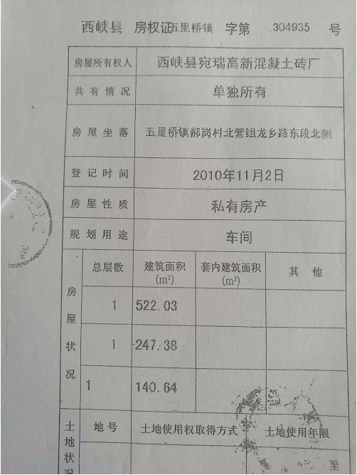 西峡县宛瑞高新混凝土厂位于县城龙乡路与白羽路交叉口东段900米,面积16900多平方米,占地26亩。因县城扩街本宗地面临拆迁,升值空间极大。按目前该段门面15000每平计算,该地盘总价值数千万元。
