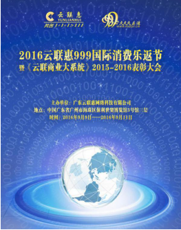 2015年的9月9日,《云联商务大系统》模式已初露锋芒,广东云联惠网络科技有限公司结合所取得的市场成果,以变革行业的创造力,举办了第一届 “云联惠999国际消费乐返节”,来自全国和世界各地的代理运营公司,众多线上线下云联惠联盟商家、众多云粉会员共襄盛举,第一次举办便成功打造出一个普惠大众、具有国际属性的大型消费节日。首届“乐返节”举办期间,参展人数持续爆棚,各展位的成交势头喜人,各种招商和路演活动精彩纷呈,其中的注册赠送积分,购房返还新模式,时尚产品秒杀等,不断把“乐返节”推向高峰,使整个乐返节洋溢着热烈惠购,快乐返还的气氛。
