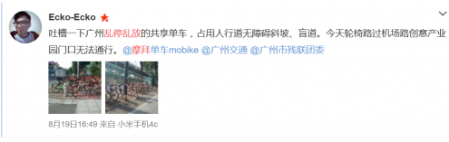 广州网友@Ecko- Ecko在微博表示:摩拜占用人行道无障碍斜坡,造成园门口无法通行。