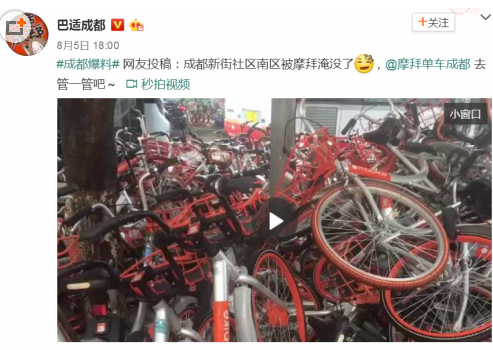 8月5日,巴适成都曝光了摩拜单车故障车在成都新街社区堆积成山的事实。从网友秒拍的视频来看,数百辆摩拜单车堆在一起,场面壮观。