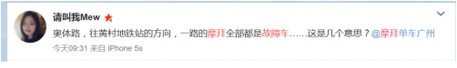 8月22日上午,广州用户@请叫我Mew在微博吐槽:奥体路,往黄村地铁站的方向,一路的摩拜车全部都是故障车……