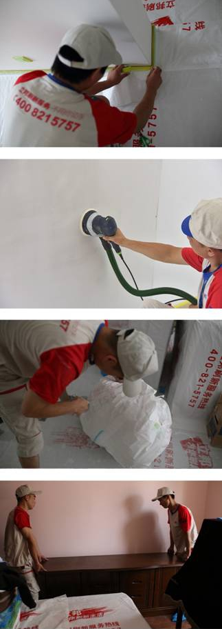 施工人员帮台女士搬移家具,并保护家具,避免他们被磕碰及沾染灰尘,全程完全不需要台女士动手,非常省心。台女士介绍说,立邦刷新服务是使用打磨法拉利跑车的工具来打磨墙面,保持施工现场整洁,自己不用操心,就可以住到想要的居室环境。