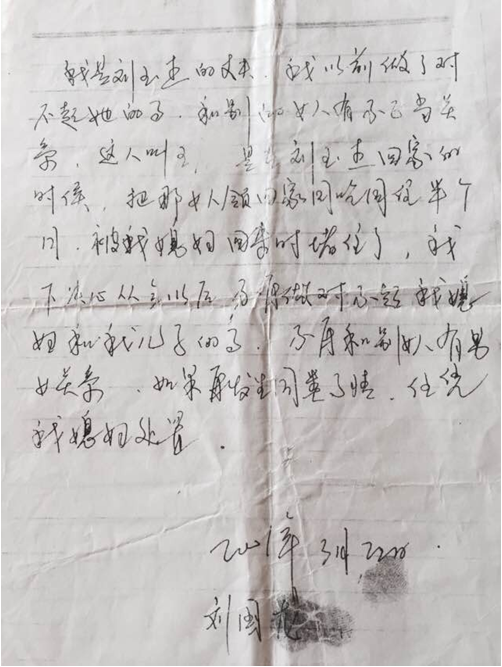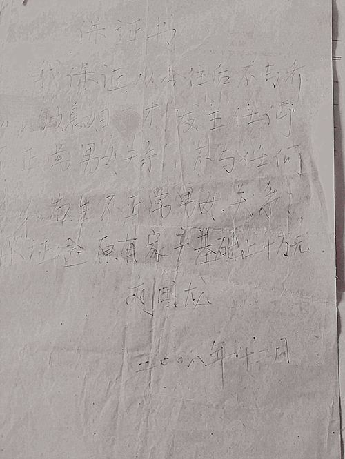 2001年3月22日,刘国龙写下保证书:“我是刘玉杰的丈夫,我以前做了对不起她的事,和别的女人有不正当关系,这人叫王X,是刘玉杰回家的时候,把那女人领回家同吃同住半个月,被我媳妇回来时堵住了,我下决心从今以后,不再做对不起我媳妇和儿子的事,不再和别的女人有男女关系,如果再发生同类事情,任凭我媳妇处置。”