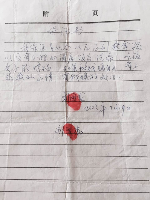 2003年7月,刘国龙再次写下保证书:“我保证从今以后,不到桑拿洗浴及有小姐的酒店饭店洗澡、吃饭,更不能嫖娼,如果被我媳妇,有上述类似事情,有我媳妇处办。”