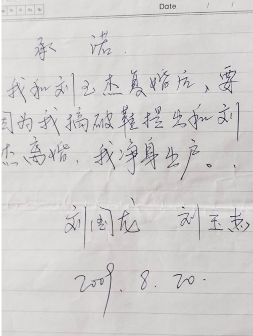 2009年8月20日,刘国龙承诺:“我和刘玉杰复婚后,要因为我搞破鞋提出和刘玉杰离婚,我净身出户。”
