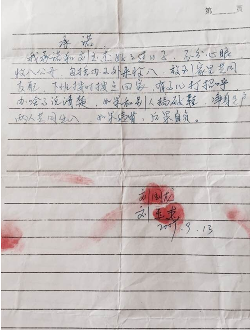2009年9月13日,刘国龙承诺:“我承诺和刘玉杰好好过日子,不分心眼,收入公开,包括办事外来收入,放到家里共同支配,下班按时按点回家,有事儿打招呼,办啥事说清楚,如果和别人搞破鞋,净身出户。两人共同出入,如果违背,后果自负。”