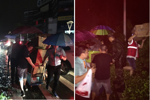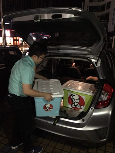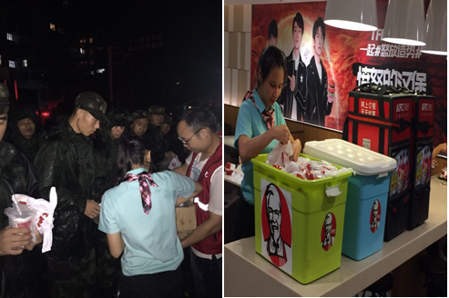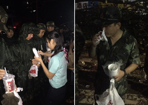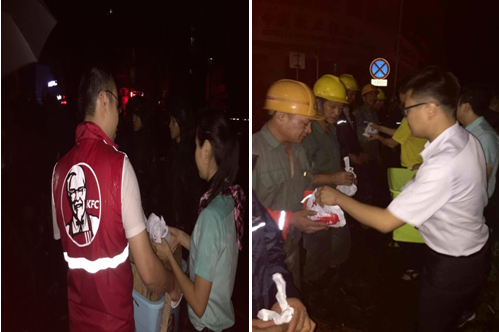 8月23日,超强台风“天鸽”袭击珠海,造成部分地区交通受阻、停水停电。珠海肯德基连夜赶制大批餐点,风雨中给奋战在抢修一线的武警官兵和市政工作人员等送去热气腾腾的食物,表达慰问和感谢。