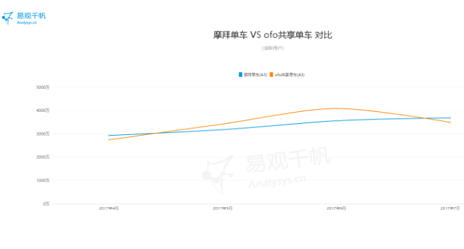 在备受关注的活跃用户量方面,今年7月摩拜单车日均活跃用户量达738万,环比增长13%,保持稳健增长;ofo则今年6月的最高点下滑至554万,环比降幅35%,出现“断崖式下跌”。摩拜单车的领先幅度达33%。从整月数据来看,摩拜单车仍然占据优势:7月摩拜单车活跃用户量达3673万,环比增长3%;ofo则为3482万,环比下滑15%,颓势明显。