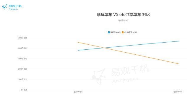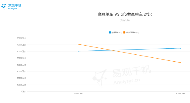 在APP启动次数方面,今年7月摩拜单车APP启动次数达6.48亿次,环比增长8%;ofo启动次数为4.32亿次,环比下滑39%;摩拜单车的领先幅度约50%。7月份,摩拜的日均APP启动次数为2091万次,环比增长4%;ofo为1395万次,环比下滑41%。在日均APP启动次数方面,摩拜单车领先ofo50%。
